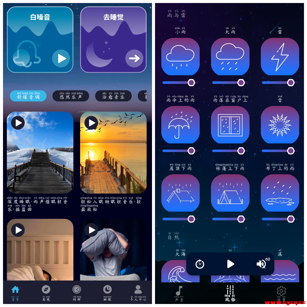 两款手机助眠App,舒缓助眠,宁静入睡!提供多种自然声音、白噪音、冥想音乐,帮助你放松心,改善睡眠质量,让你拥有一个好的夜晚。界面简洁,作便捷,是你的睡眠好帮手!(解锁VIP功能)