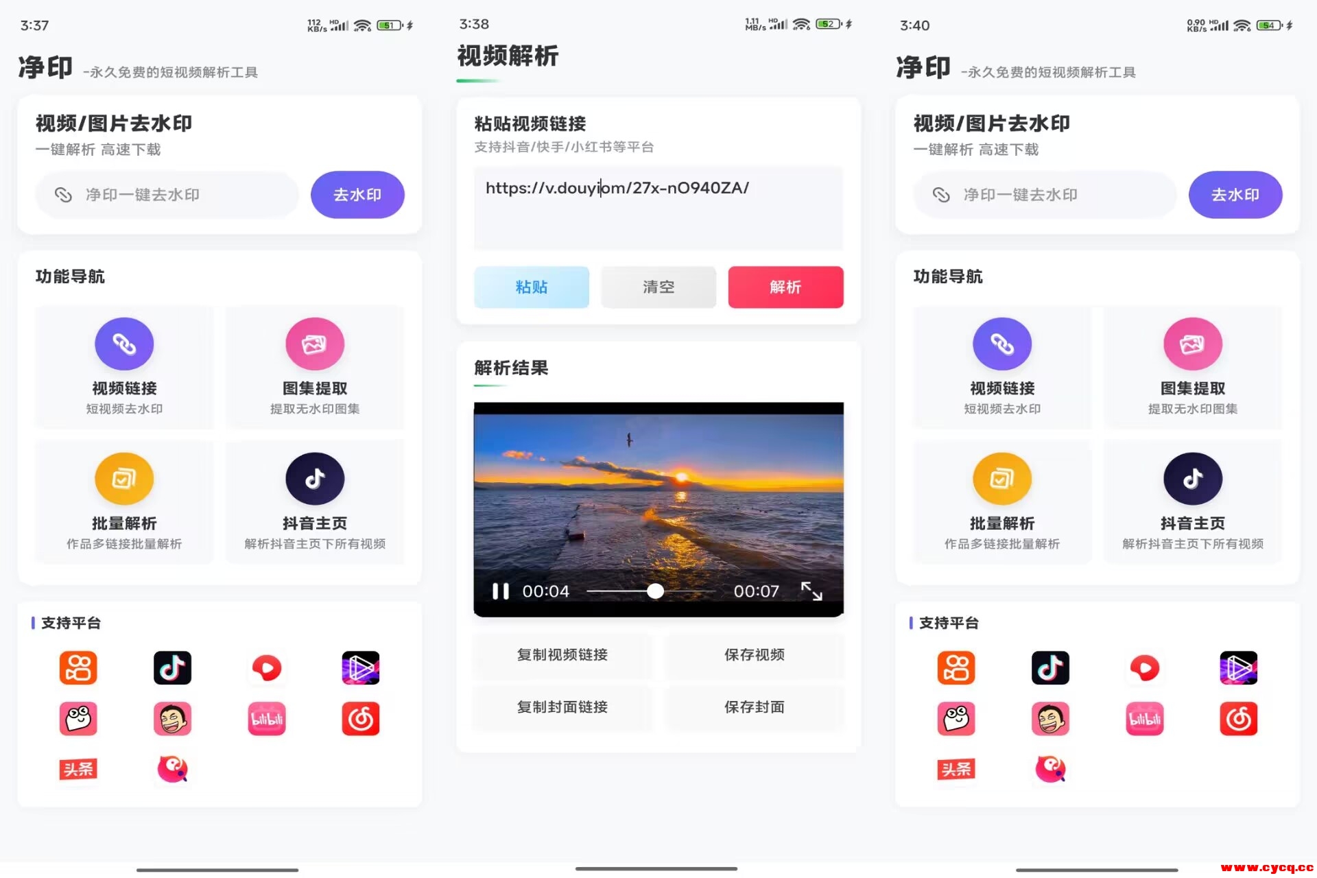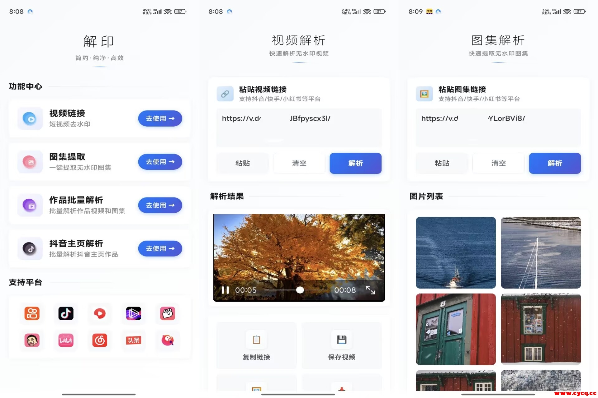 【使用说明】:一款手机短视频处理App,去水印解析,轻松编辑!提供短视频去水印、视频解析、图集解析等多种功能,让你轻松处理短视频,创作个性化内容。界面简洁,操作便捷,是你的短视频创作好帮手!解锁VIP 去广告 去更新 简化布局 支持各大平台去水印解析批量解析图集视频