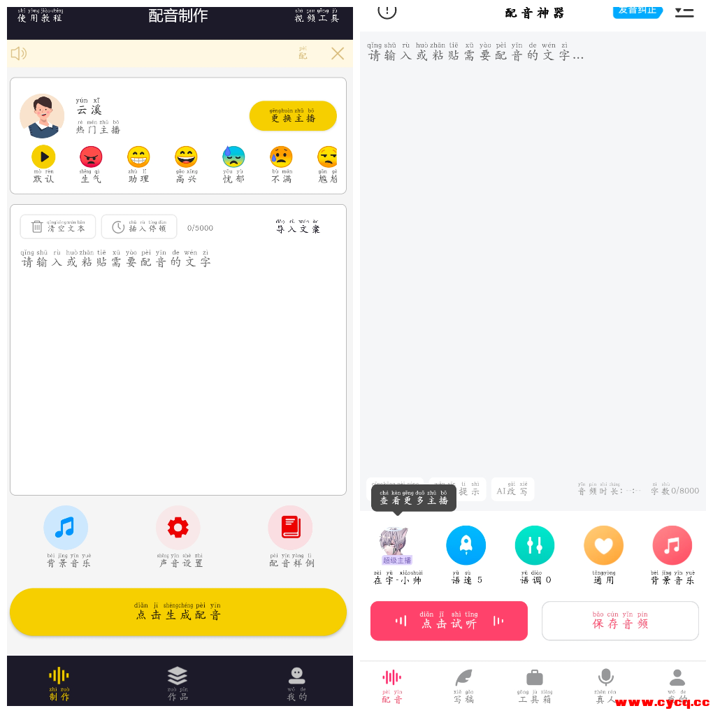 两款手机自助配音App,各种配音一键生,创意无限! 提供文字转语音、配音制作等功能,让你轻松制作配音,应用于视频、广告、有声书等场景。 界面简洁,作便捷,是你的配音制作好帮手!(登录解锁VIP功能)